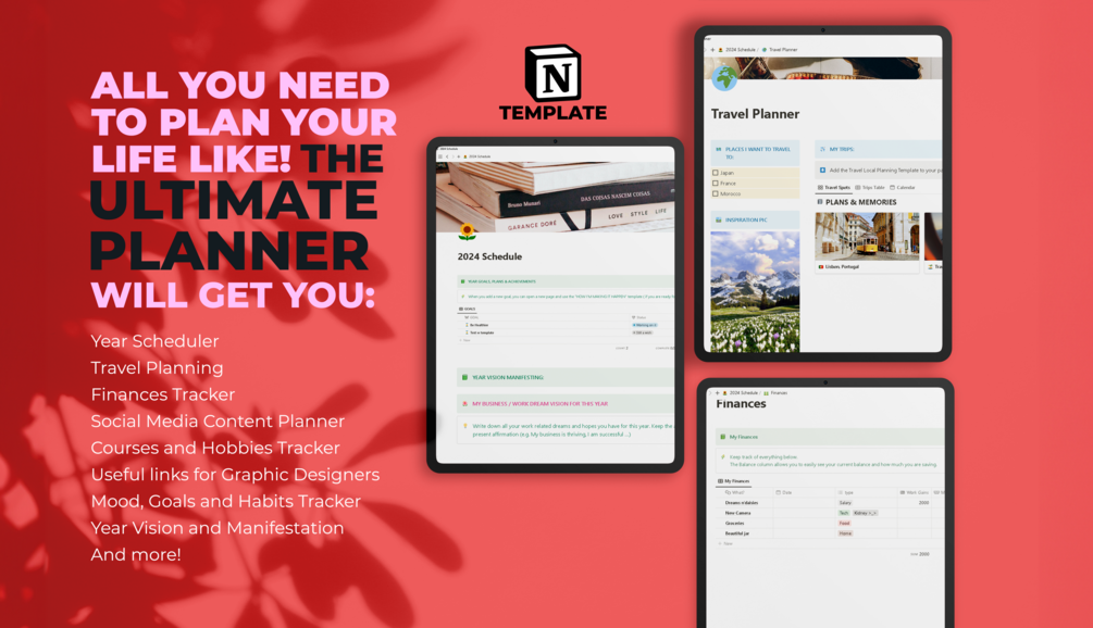 You will get the ultimate notion template to help you manage your life! From your mood, to habits, to appointments and travels. Even your finances. It has it all!